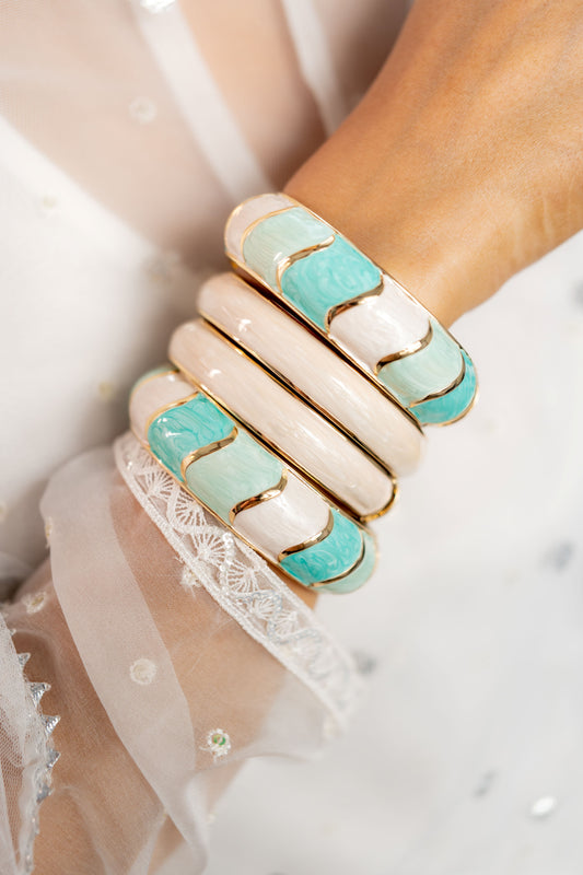 Enamel Gold-Plated Statement Turquoise and Ivory Bangles Stack